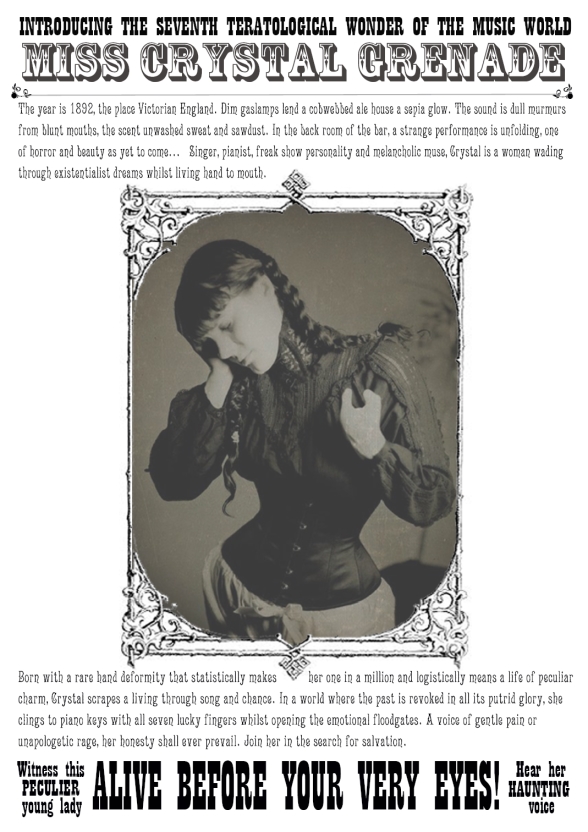 And now to introduce another Mancunian songstress, with this strange and oddly challenging city deep within her musical DNA. Miss Crystal Grenade, has been described as “Shakespeares Sister fighting Amanda Palmer and Tori Amos in a dimly lit Victorian pub. With hand deformities.” And that’s a pretty good way of putting it. Miss Crystal Grenade explores the darker side of life, framed by the concept of Freak Show life of the late 1800s. Whether she is indeed a late Victorian sideshow attraction who has only survived this long because of her fragile beauty and low cunning, or whether she is a character created by critically acclaimed singer and pianist Carol Hodge is a matter for discussion.
